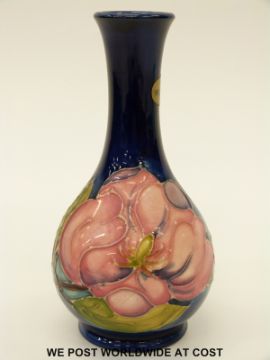 Moorcroft vase in Magnolia pattern on a blue ground (15.5cm tall)