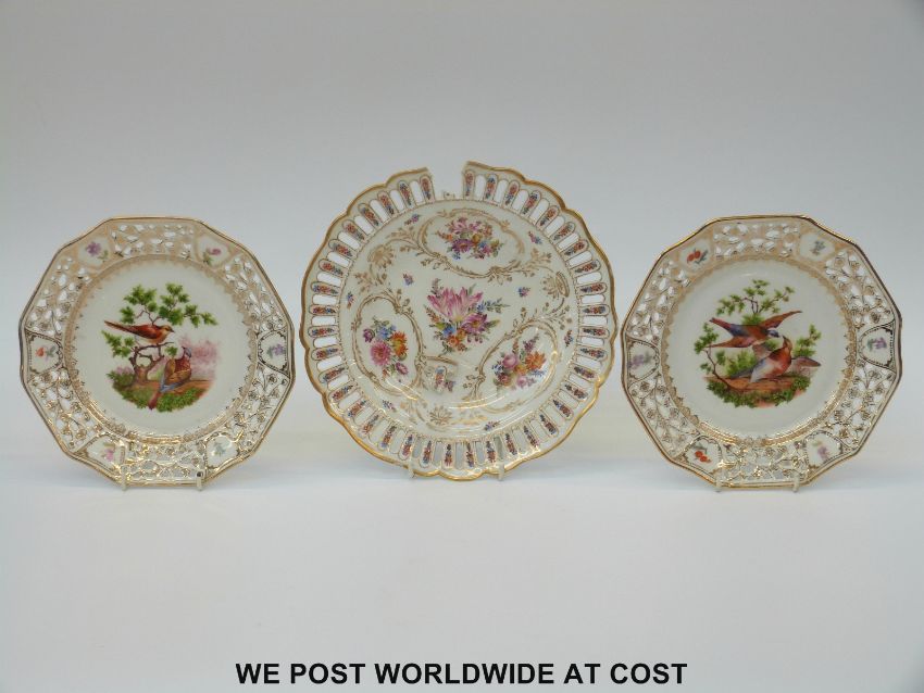 Meissen plate with reticulated rim and floral decoration and a pair of Continental plates with bird decoration to the centre