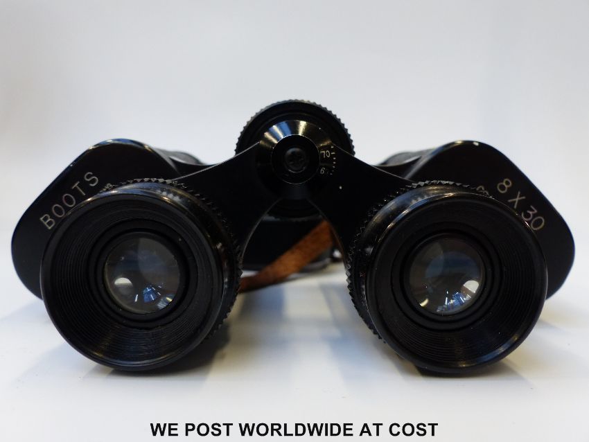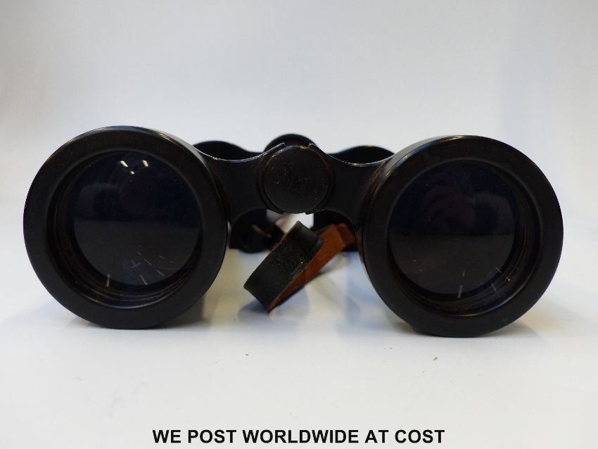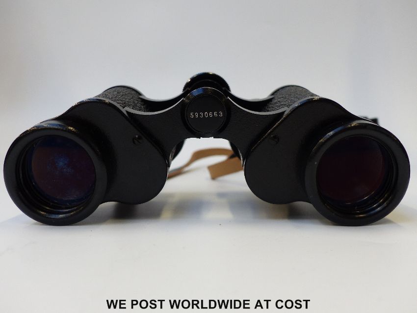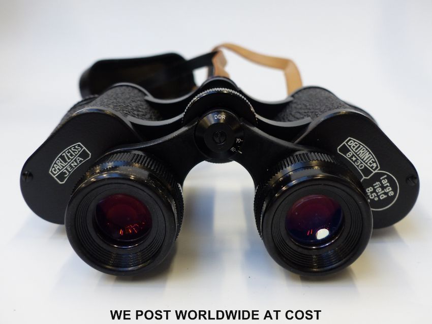 A pair of Barr and Stroud 10 x CF36 Prismatic binoculars in leather case, together with two other cased pairs of binoculars, one being Carl Zeiss Deltrintem 8 x 30 and a brass three drawer telescope