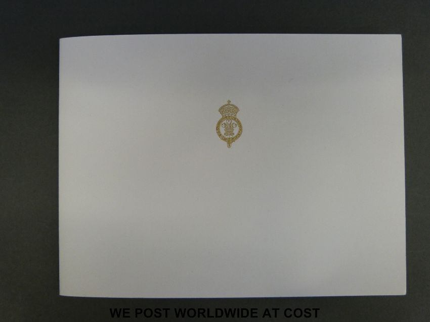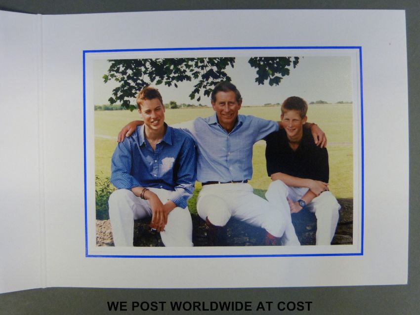 HRH Charles, Prince of Wales hand signed and inscribed 1999 Christmas greetings card with a 14x10cm colour photo of Princes Charles, William and Harry and embossed gold crest to the front, in original envelope with ERII and Buckingham Palace stamps.