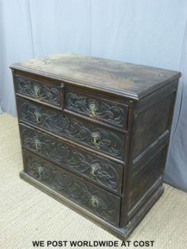 An 18th/19thC oak chest of two over three graduated carved drawers with brass mask drop handles on a plinth base (W94 x D53 x H91cm)