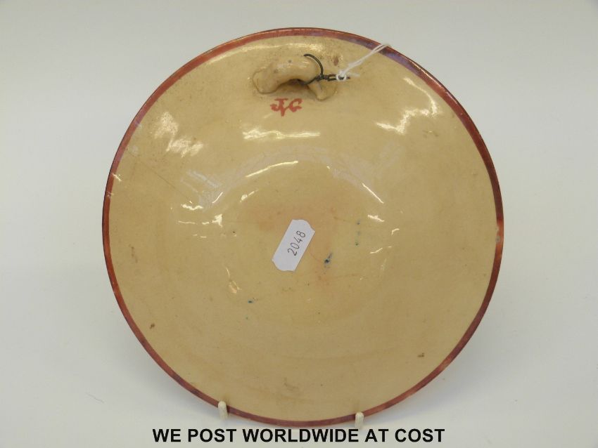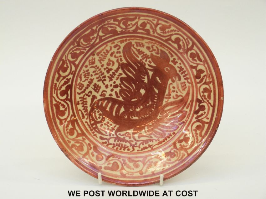 A Spanish copper lustre dish, the centre painted with a bird within a scrolling flower border
