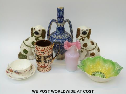 A small collection of ceramics including Staffordshire dogs, twin handled Indian pottery vase, Albert Weisse cup and saucer etc