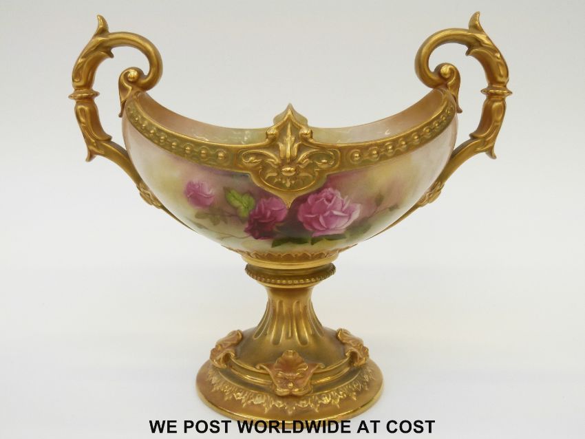 Royal Worcester twin handled pedestal bowl hand painted with roses, signed by A Lane