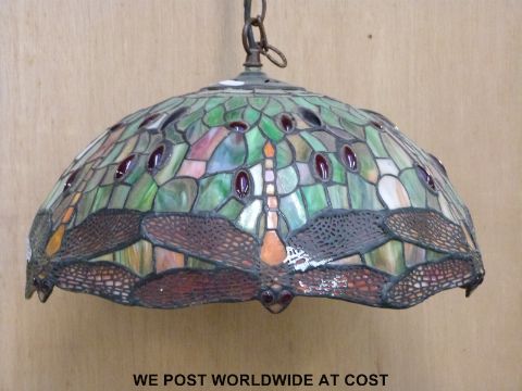 A Tiffany style glass lamp shade decorated with dragonflies (drop from ceiling boss 60cm, diameter 42cm)