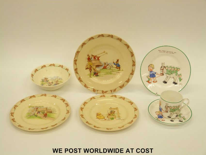 Shelley Mabel Lucie Attwell trio "Don't Forget the Fairies May Like a Lift Along the Way" together with three Royal Doulton Barbara Vernon plates and a Bunnykins bowl