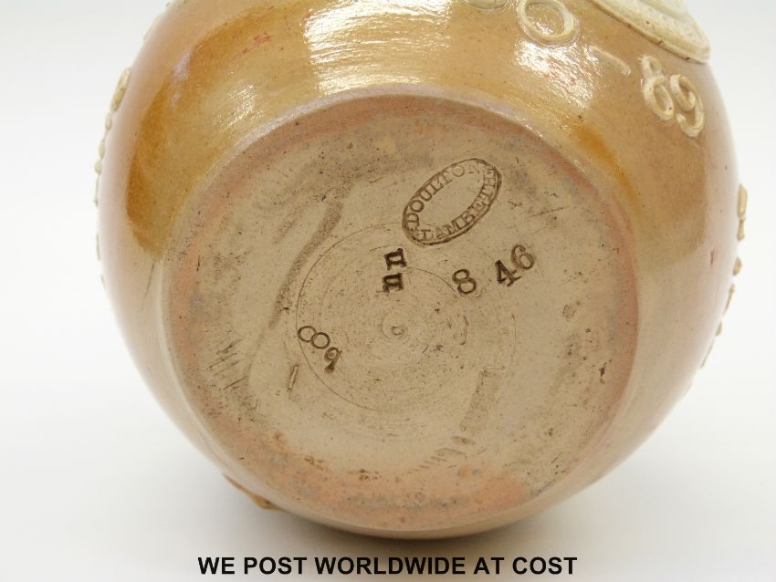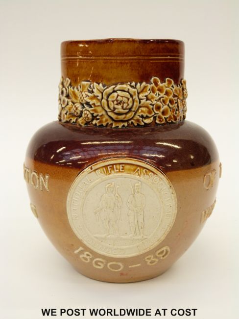 Doulton Lambeth salt glazed jug, 'National Rifle Association Commemoration of the last meeting at Wimbledon, 1860-89' (16cm tall)