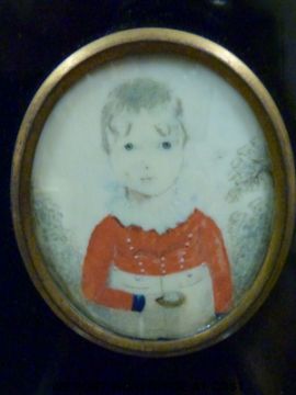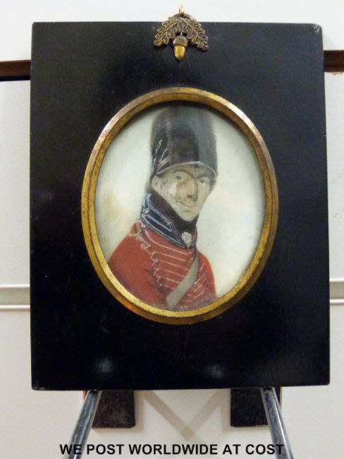 Two 19thC watercolour miniatures on ivory, one of a soldier, the other of a boy holding a bird's nest, both in ebonised frames with acorn finial hanger (largest 8.5 x 7cm)