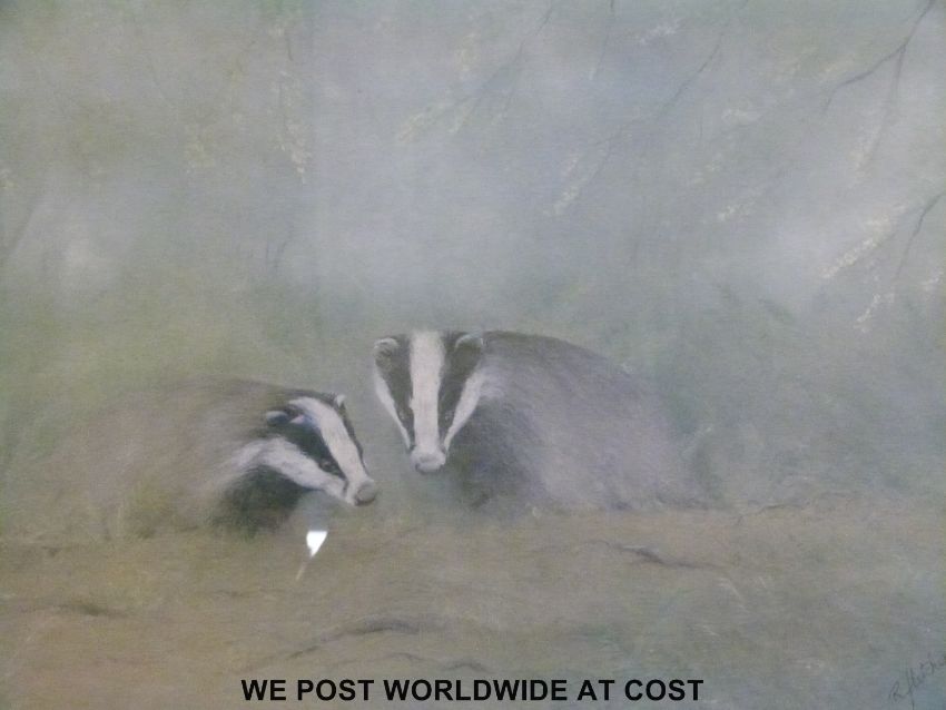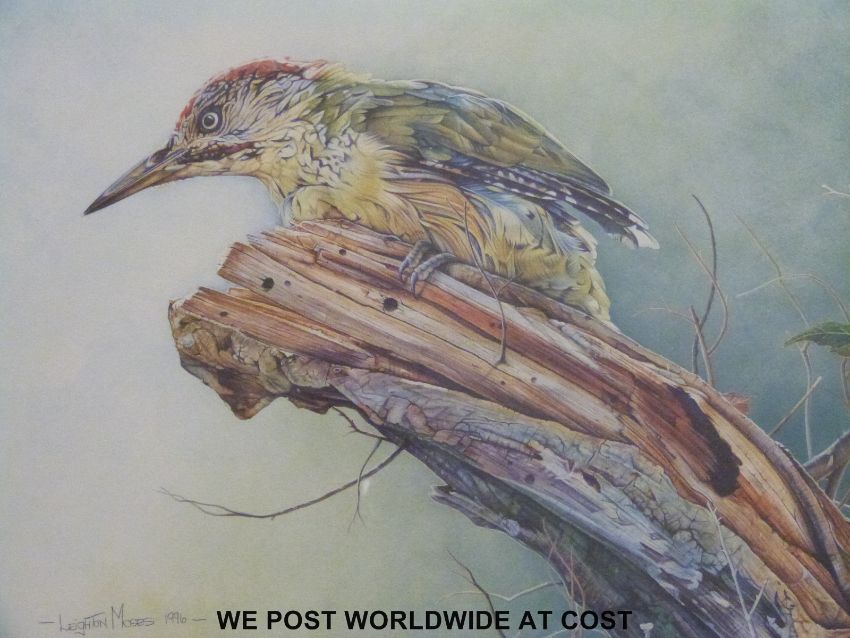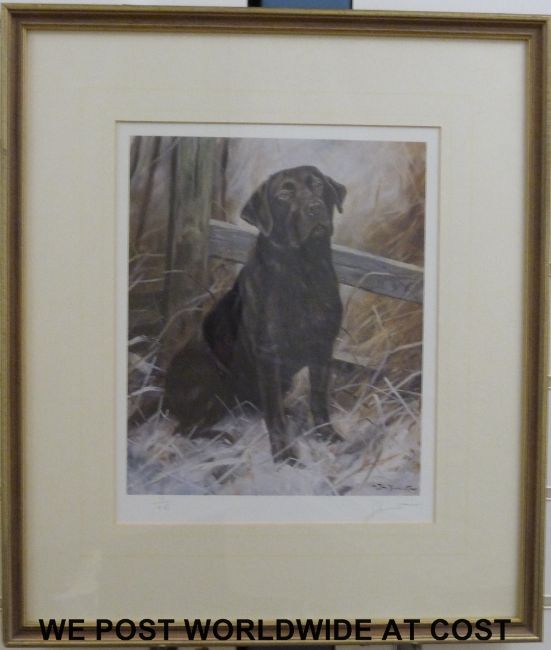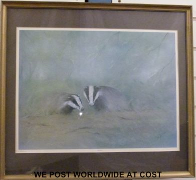 John Trickett signed limited edition print of a labrador 7/850 (34 x 27cm), Leighton Moses, signed limited edition print of a woodpecker 318/850 (33n x 42cm) and R.Fletcher signed print 'Badger' (40 x 53cm)