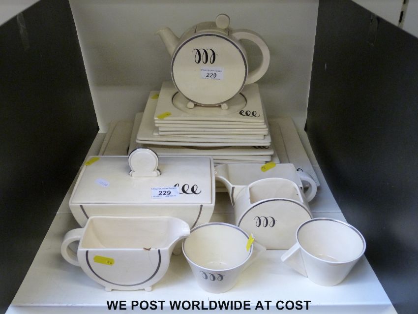A collection of Clarice Cliff Bizarre Art Deco dinner and tea ware including graduated plates, tea pot, biscuit barrel, etc., some items also marked 'Biarritz'