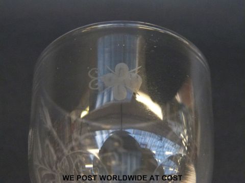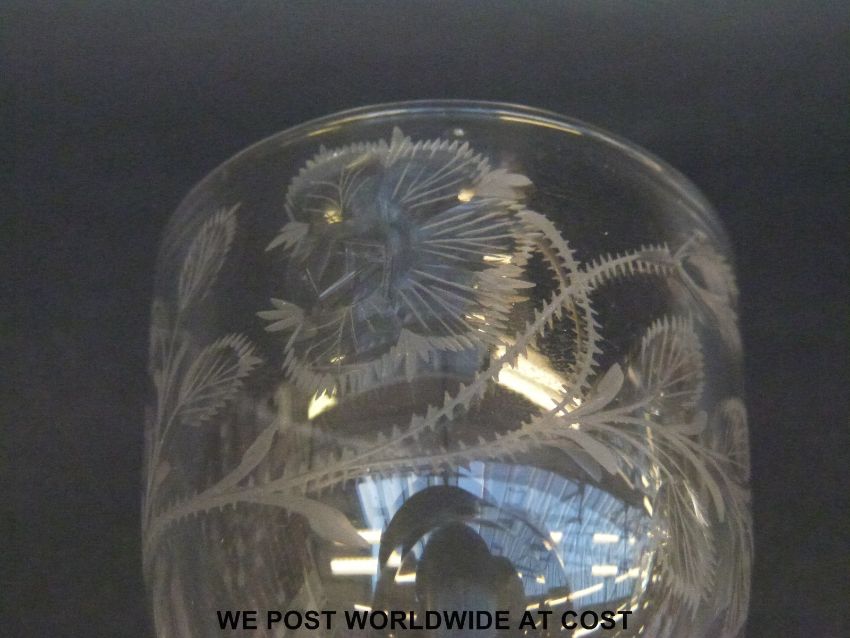 An 18thC wine glass with round funnel bowl engraved with Jacobite roses and bee over multi-faceted stem raised on plain foot, 15cm tall.