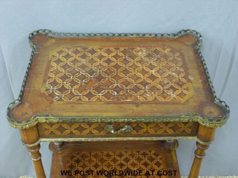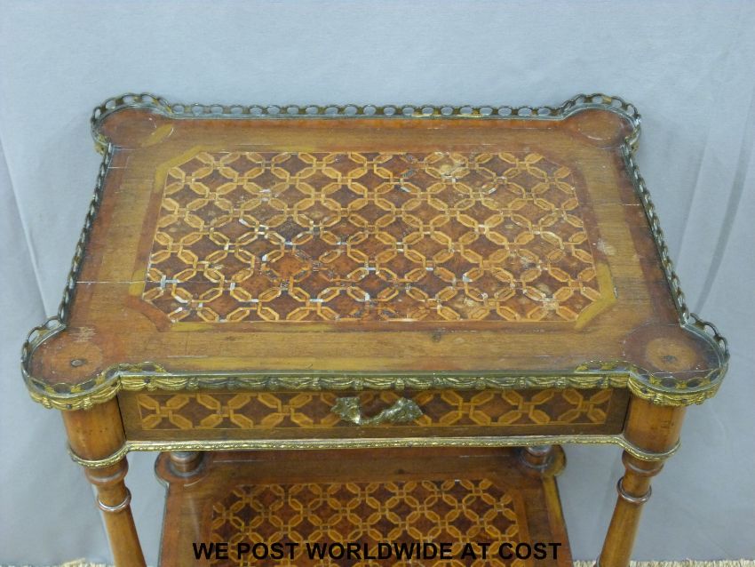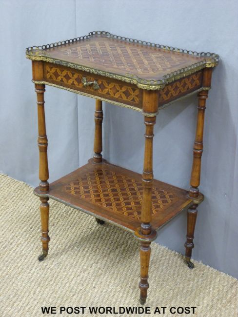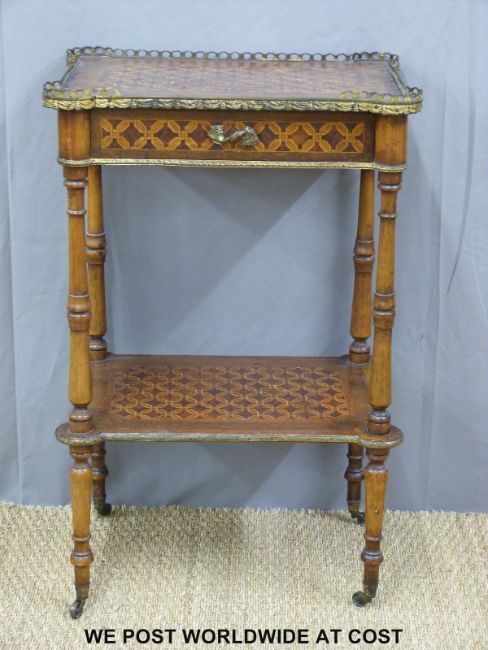 A 19thC French mahogany parqueting two tier whatnot with single drawer, pierced brass gallery and ormolu mount raised on brass castors (H82 x W53 x D32cm)