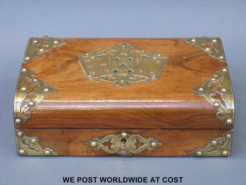 A 19thC brass bound walnut card game or similar box with playing card decoration to lid (width 26cm)