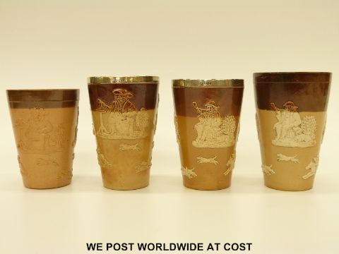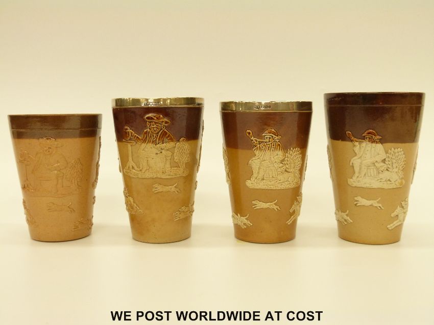 Four Doulton Lambeth salt glazed beakers including a pair with hallmarked silver mounts (tallest 12.5cm)