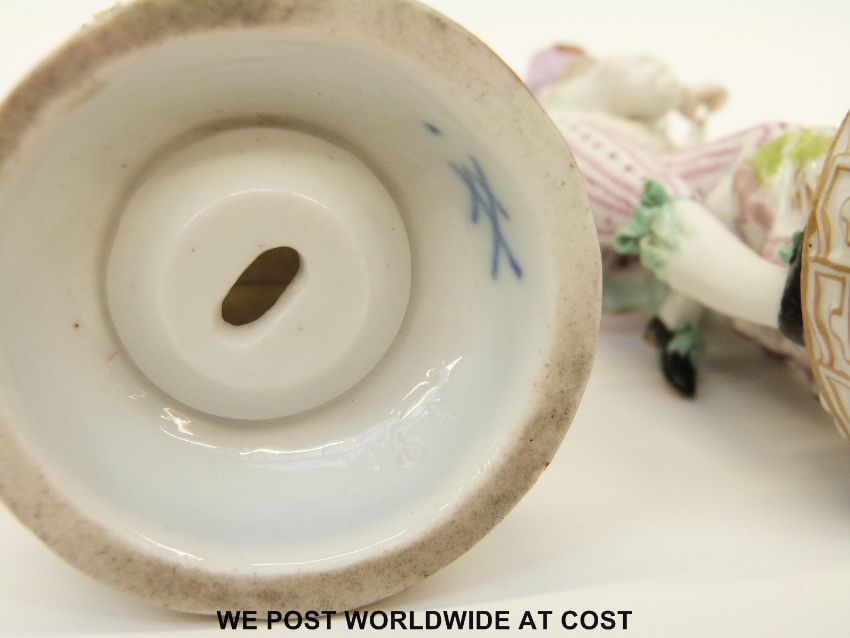 Meissen pair of figures, one a lady holding a garland of flowers, the other a young man with a carrier pigeon (16cm tall)
