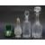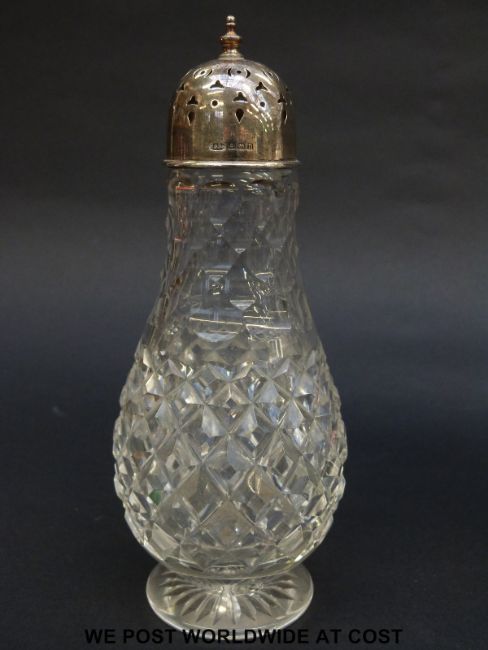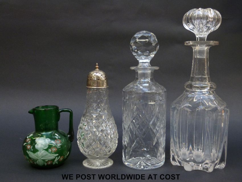 A hallmarked silver mounted cut glass sugar shaker (20cm tall), two clear glass decanters and a green glass jug.