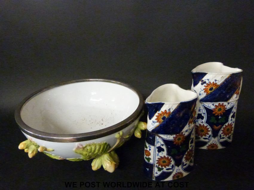 A majolica bowl, possibly Moore Brothers, and two Crown Derby Imari heart jugs (tallest 18cm)