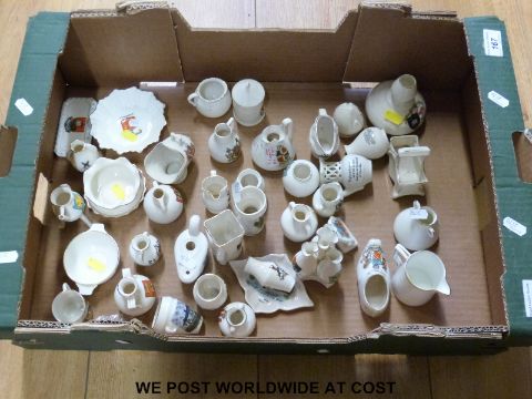 Forty pieces of mixed crested china to include W.H. Goss, Foley China & Shelley China; Metropolitan Church Toronto, Warwick Two Hamsters Jug, 'Manchester Shore, Fenarty Basket, Church Stretton vase etc.