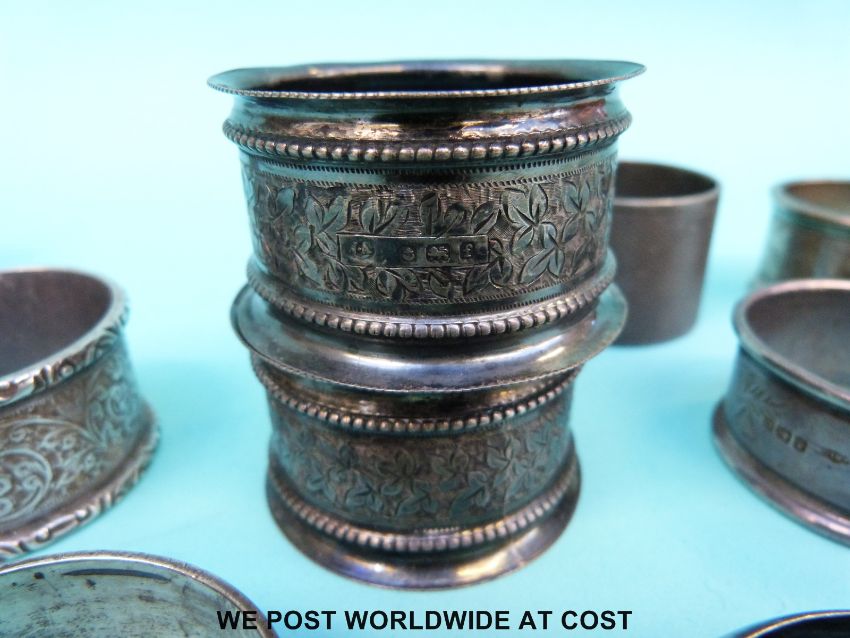 Eight various hallmarked silver napkin rings (192g) and a plated example