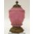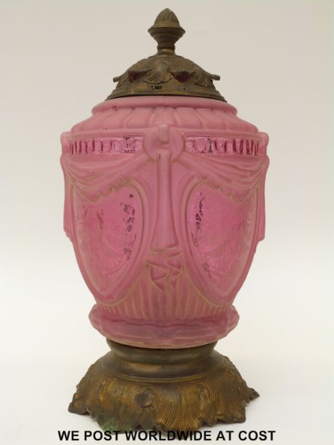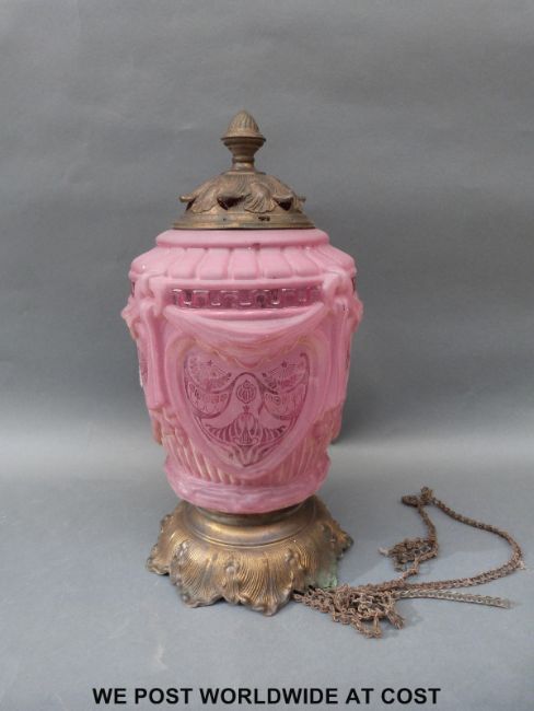 An Art Nouveau moulded and etched cranberry glass and gilt metal lamp, 39cm tall.