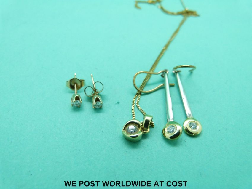 A 9ct gold pendant set with a diamond, a pair of earrings set with diamonds and a pair of diamond stud earrings