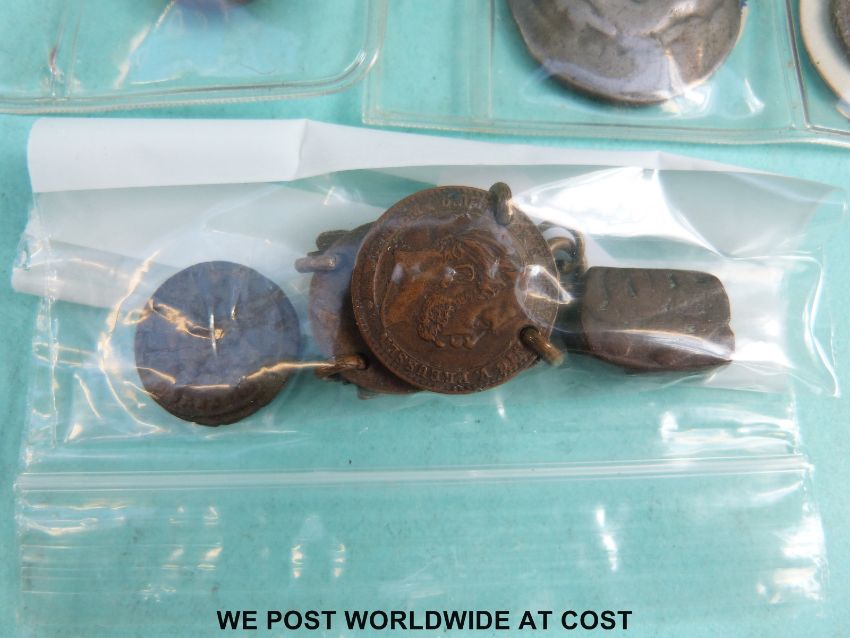 An amateur collection of Roman and other ancient coins, some "catalogued" with labels, includes seven silver examples, one being Constantine I, 16.05g, 33mm diameter