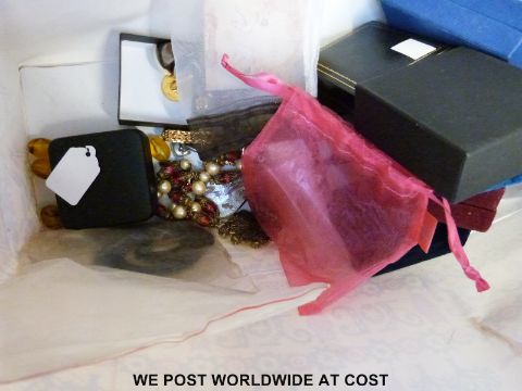 A collection of costume jewellery to include necklaces, pocket watch, Miracle brooch, agate necklace, silver plate etc