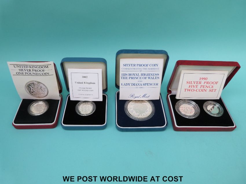 Four cased and certificated silver proof coins, comprising a double 1990 5p set, a crown and a 2002 £1 example, and an additional coin