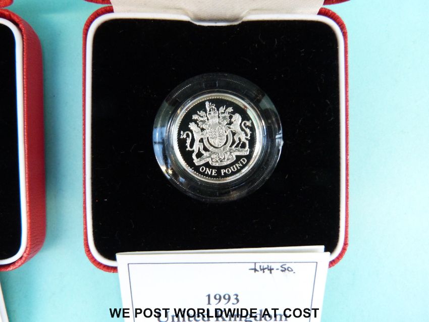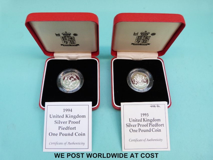Two cased UK silver proof Piedfort £1 coins with certificates 1993 and 1994