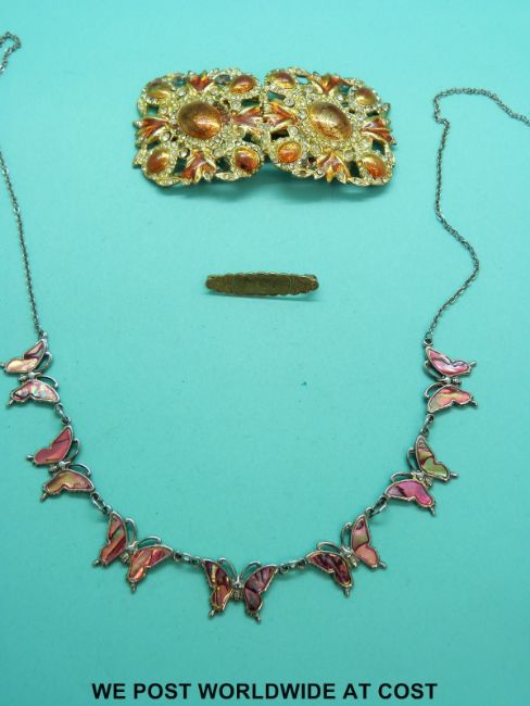 An enamel butterfly necklace, a buckle and a 9ct gold 'Baby' brooch