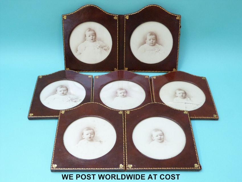 A collection of 19th/20th century tooled leather photograph frames by Walter Jones, Sloane St, London, height 15cm, comprising five single and one double frame