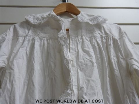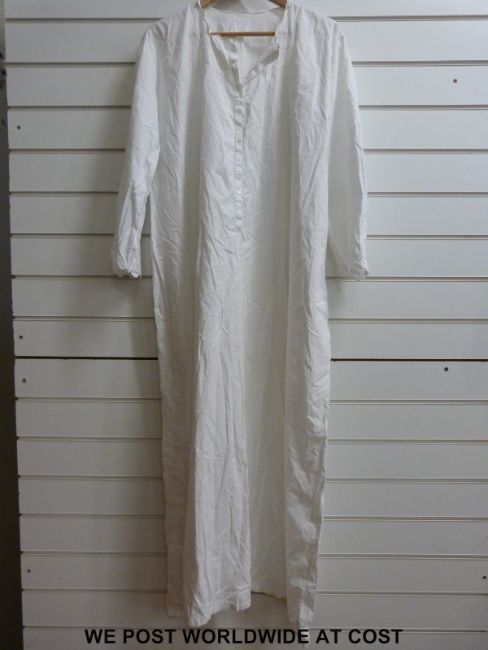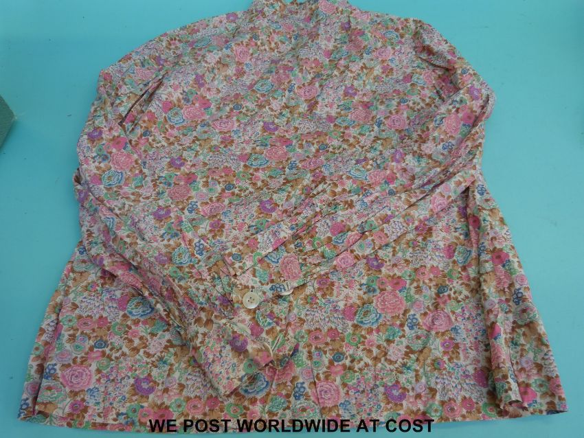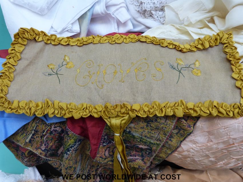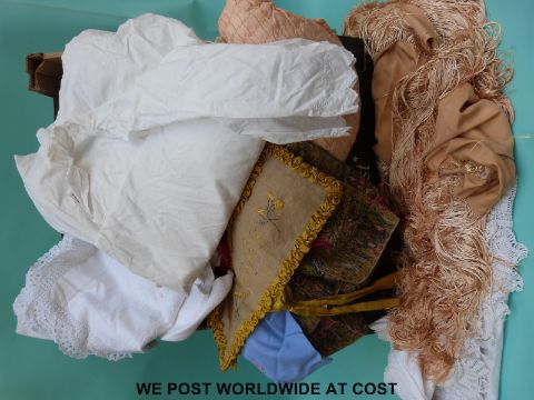 Three boxes of fabric off-cuts and linen to include three night dresses, table covers, blankets etc.