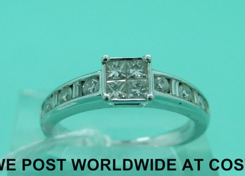 An 18ct white gold ring set with four princess cut diamonds and three round cut diamonds to each shoulder (size N)