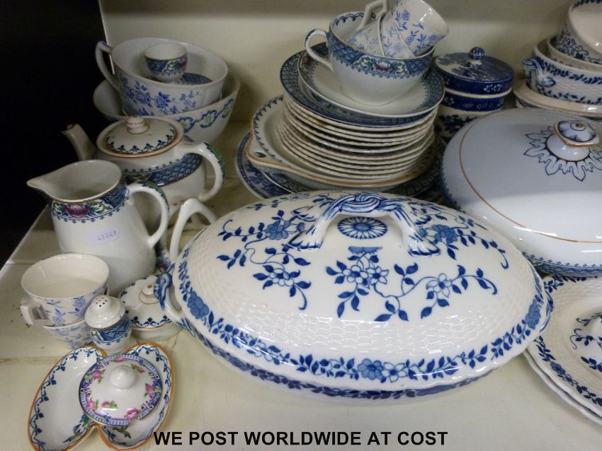 A large collection of blue and white ceramics including Spode and a large creamware candlestick