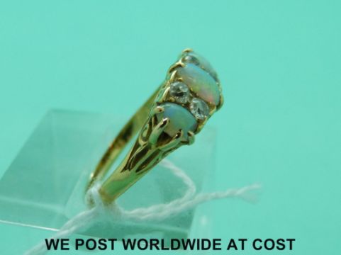 A Victorian/Edwardian yellow metal ring set with three opal cabochons and four old cut diamonds (size O)