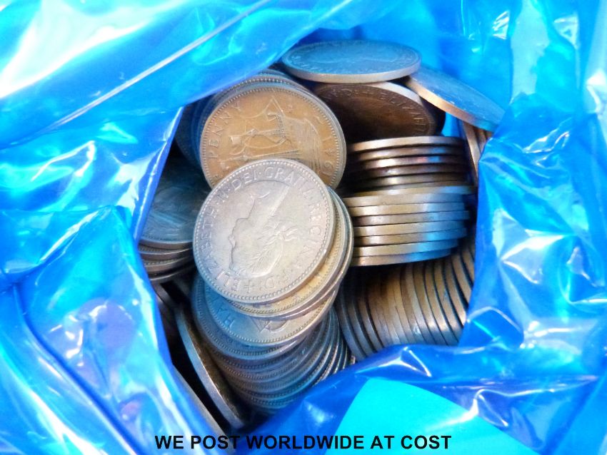 Two biscuit tins of UK coinage largely copper but with a quantity of cupro nickel post 1953 shillings. 20kg in all.