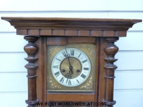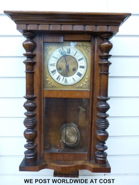 A c1910 two train wall clock in half bobbin turned case, the ivory coloured chapter ring with Roman numerals and sunburst central decoration, 59cm tall