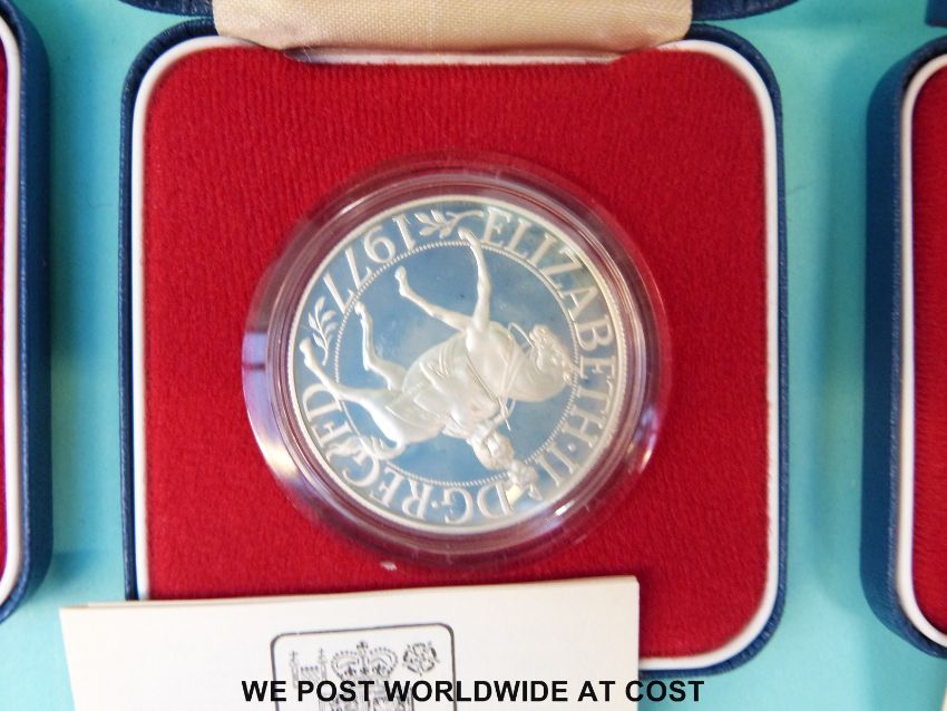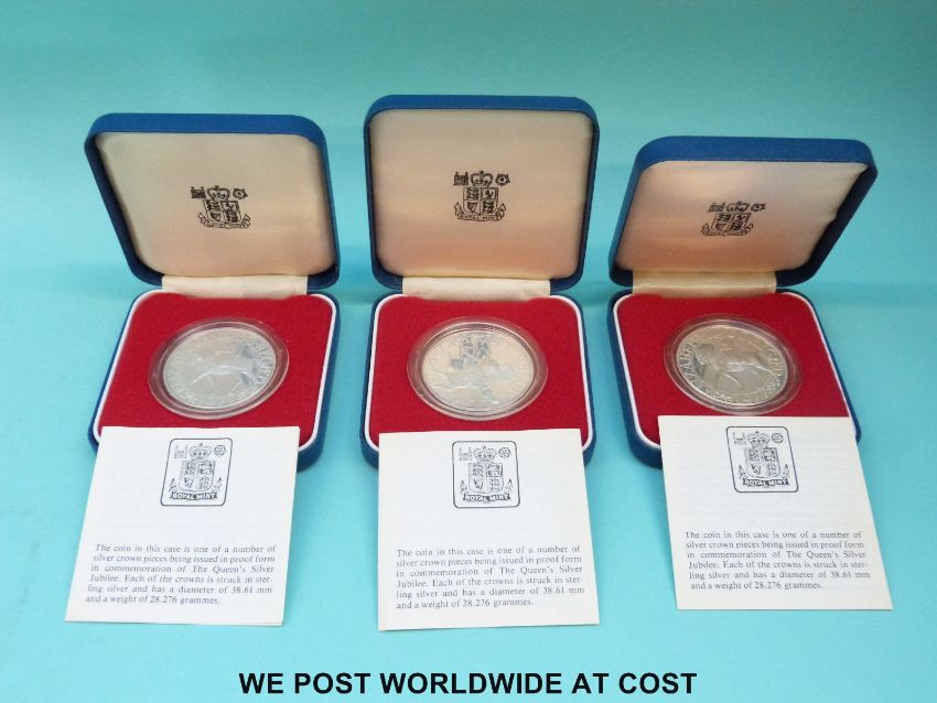 Three cased Royal Mint Silver Jubilee crowns with certificates, 28.276g each