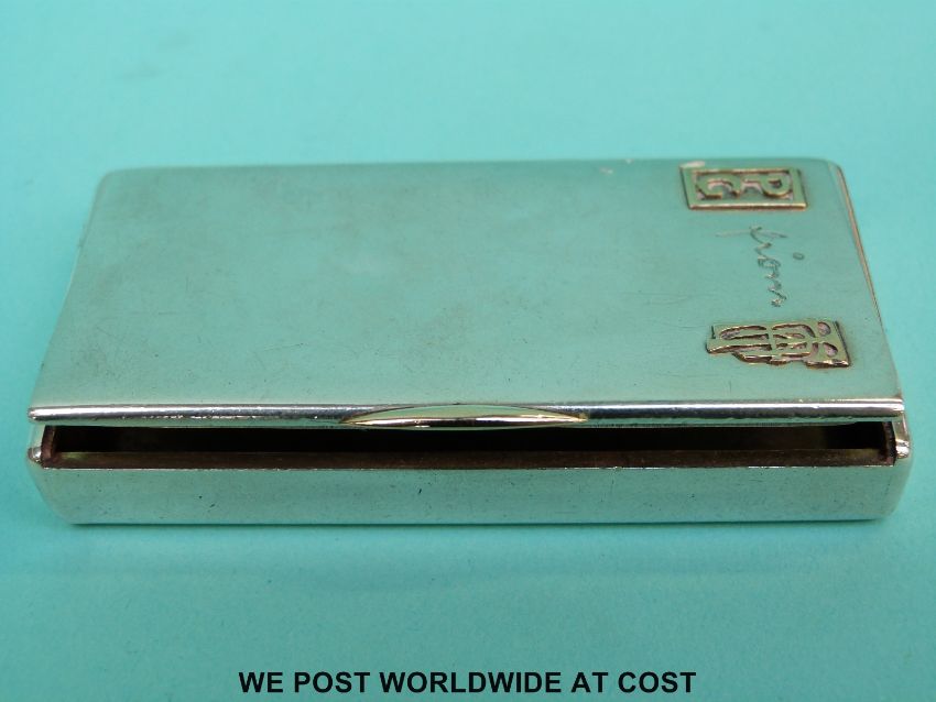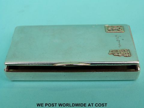 A continental white metal snuff box with gold initials to front, marked Merkur and 84 FW and maker's mark MI or IM, length 8.5cm