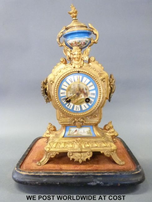 A 19th century French Ormulu two train clock with masked details and Sevres panel decoration, the unnamed movement numbered 1276 striking on a bell, the Sevres dial with Roman numerals, gold coloured beetle and poker hands, raised on a plinth