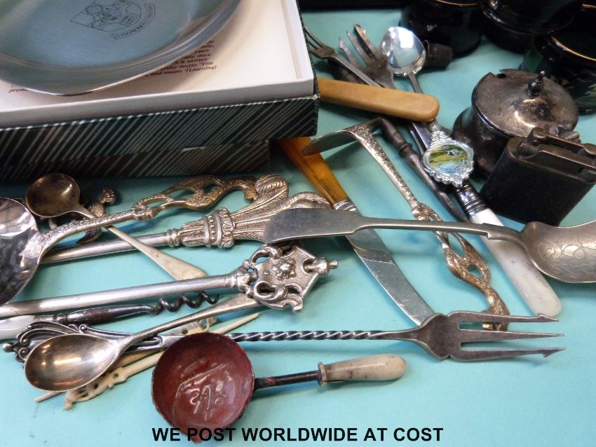 A collection of silver plate to include cutlery, lacquer napkin rings etc