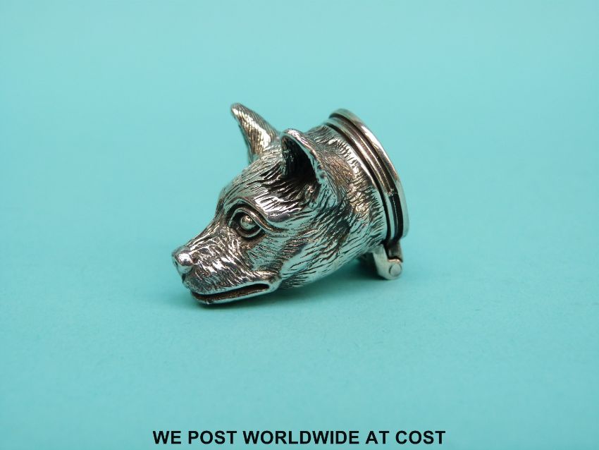 A white metal snuff box or trinket pot formed as a dog's head with hinged lid, stamped 925, length 33mm (36g)