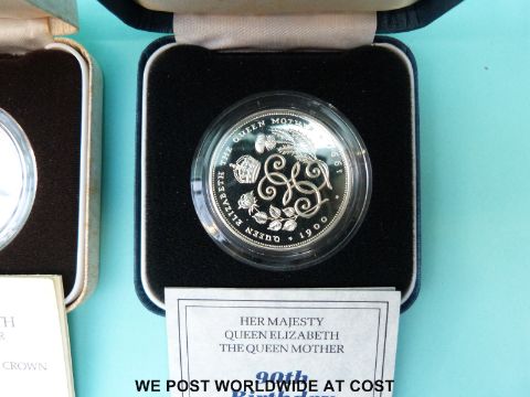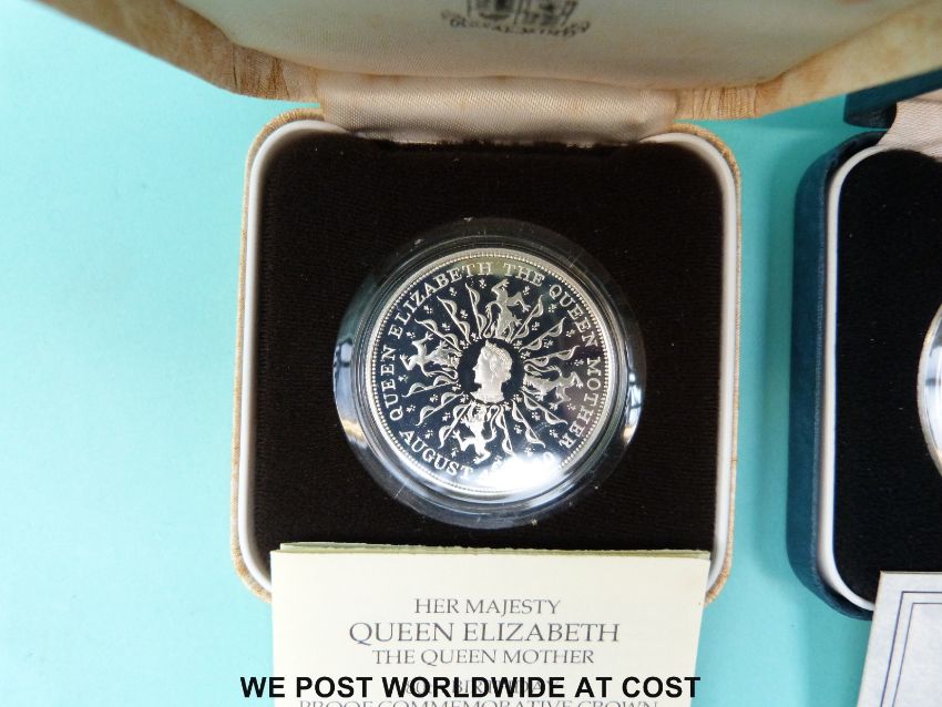 Queen Mother 80th Birthday cased silver crown, together with a 90th Birthday example, both with certificates