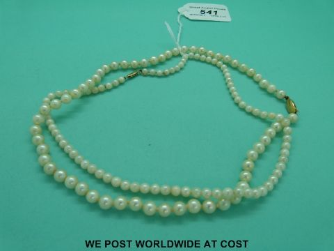 Two stands of cultured pearls both with 9ct gold clasps.