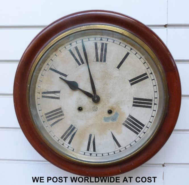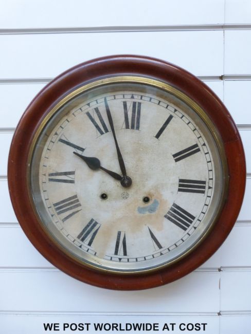 A two train Ansonia, American dial clock in mahogany case with painted Roman dial and spade hands, 42cm case diameter