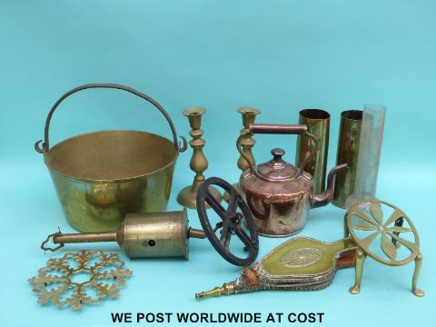 Brass shell cases, copper kettle, trivet, jam pan etc.