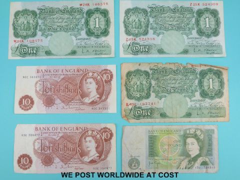 Two Chinese Republic 5000 yuan banknotes, comprising one 1945 issue and a 1947 example, both in circulated condition together with six UK £1 notes, and two ten-shilling notes of Hollom, circulated but some still crisp