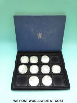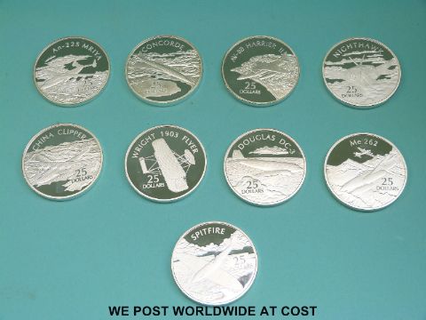 Nine silver 25 dollar 2003 Solomon Islands crown sized coins, commemorating famous aircraft, including Concorde, Harrier etc.
