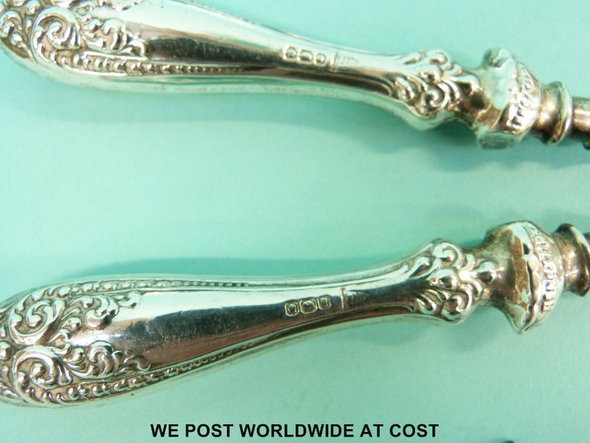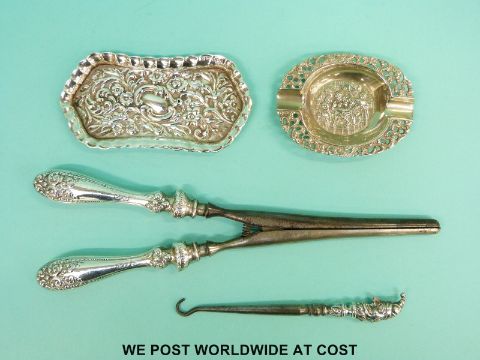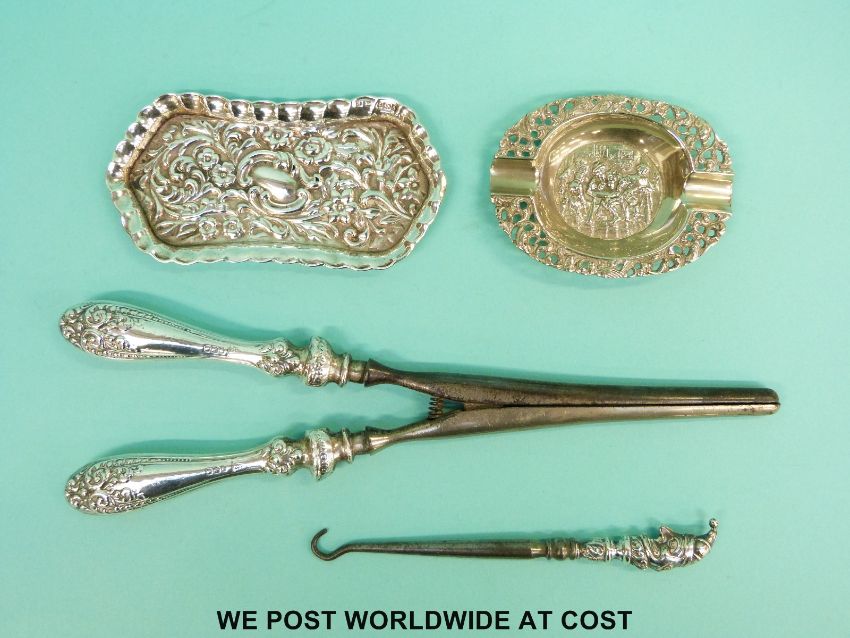 A hallmarked silver Punch button hook, silver tray (length 10cm), silver handled glove stretchers and a small plated ashtray