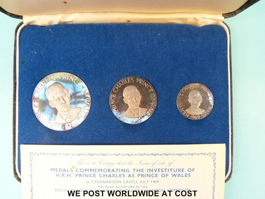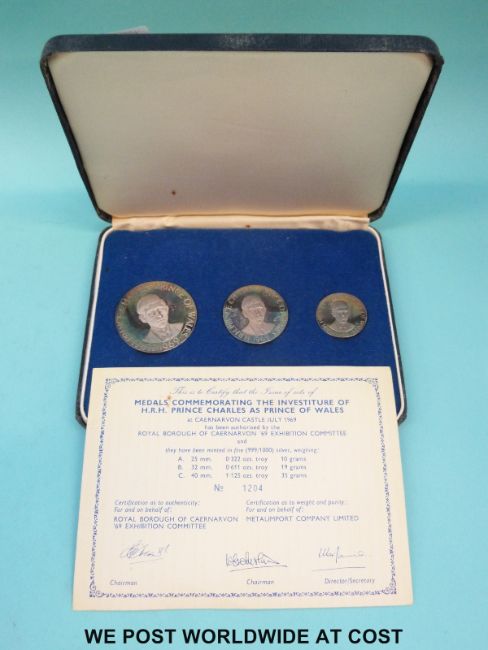 A cased set of three silver medal coins commemorating The Investiture of HRH Prince Charles as Prince of Wales, with certificate 1204